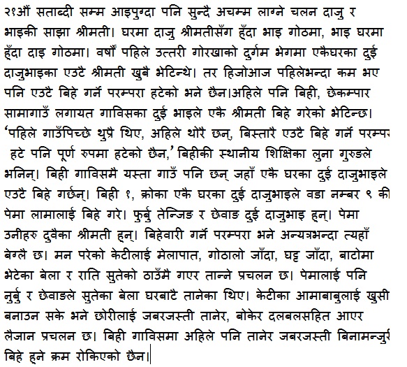 Years ago in northern remote area of Gorkha District, there use to be lots of such families in which brothers use to share a single wife. Nowadays this number is decreasing but the system still exist. Even now, we can find some brothers sharing a wife in Bihi, Chekampar and Samagau V.D.C.